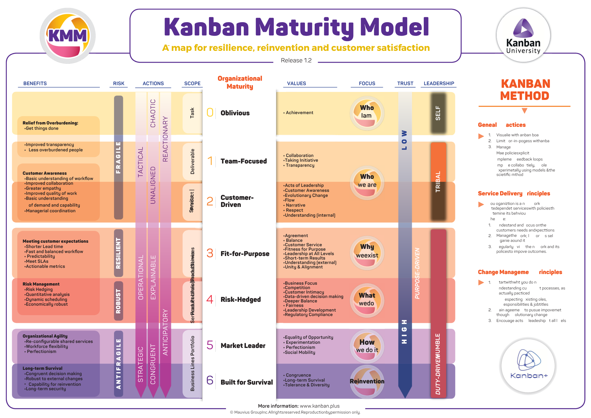 O KMM consolida mais de uma década de observações sobre padrões Kanban em empresas reais. Ele mapeia práticas típicas (ex.: limitar WIP, cadências, políticas explícitas), valores culturais (colaboração, foco no cliente, transparência) e resultados esperados (previsibilidade, satisfação do cliente, resiliência) ao longo de sete níveis. Isso permite alinhar ambição e contexto: em níveis iniciais, adota-se o mínimo viável para estabilizar o serviço; nos níveis intermediários, as práticas são aprofundadas e integradas entre equipes; nos níveis avançados, a organização como um todo opera orientada a serviços, com decisões cada vez mais baseadas em dados e propósito do cliente.